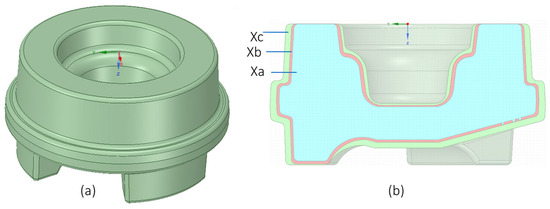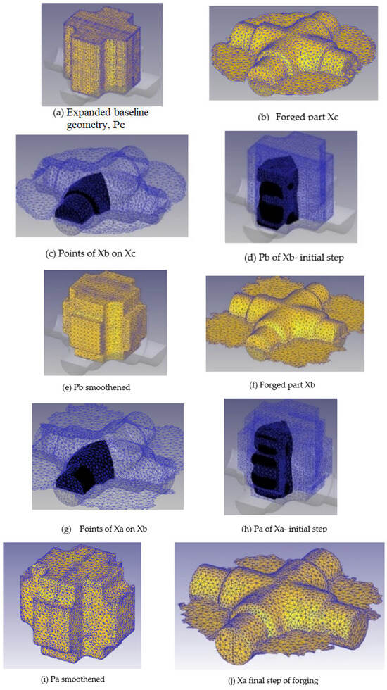 FE iterations for preform determination are shown in Figure 11. Due to symmetry, only a half 3D FE model was simulated. In the first iteration, the expanded baseline geometry Pc was used to forge a larger part, Xc, as shown in Figure 11b. Subsequently, the boundary surface of the target part, Xb, was mapped onto Xc to identify the region of interest for backtracking, as depicted in Figure 11c.