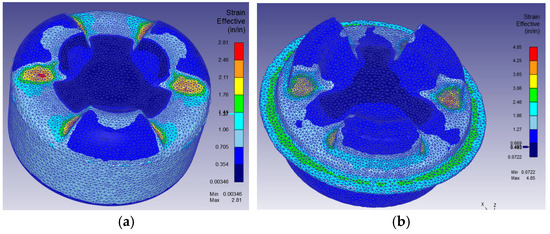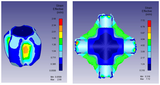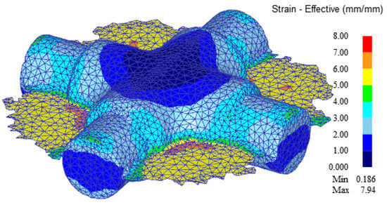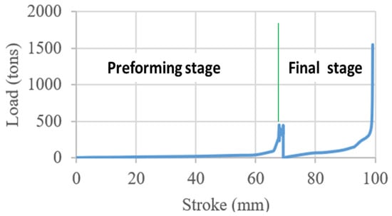 Figure 12 shows the effective strain distribution for forging the cross-joint using the established preform. Flash regions exhibited maximum effective strains around 7.4, while the bulk material exhibited strains near 5. Forging loads for both the preforming and final forging stages are shown in Figure 13. The maximum load obtained for preforming was 480 tons, whereas the maximum load for the final stage was 1000 tons. It should be noted that at the end of the stroke, the load jumps, indicating that the actual forming load should be lower than what is reported here. It can be observed that by using the intermediate preform stage, the volume of the billet is reduced by approximately 13.5%.