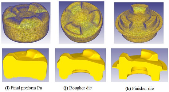 A second iteration was begun by forging Xb using preform Pb, the simulation results of which are shown in Figure 11f. By backtracking material points from Xb, Pa can be obtained. The last FE iteration involved forging preform Pa, resulting in part Xa with a minimal amount of flash (Figure 11j). The uniformity in the material flow observed in the final part suggests that an additional FE iteration will completely eliminate the flash.