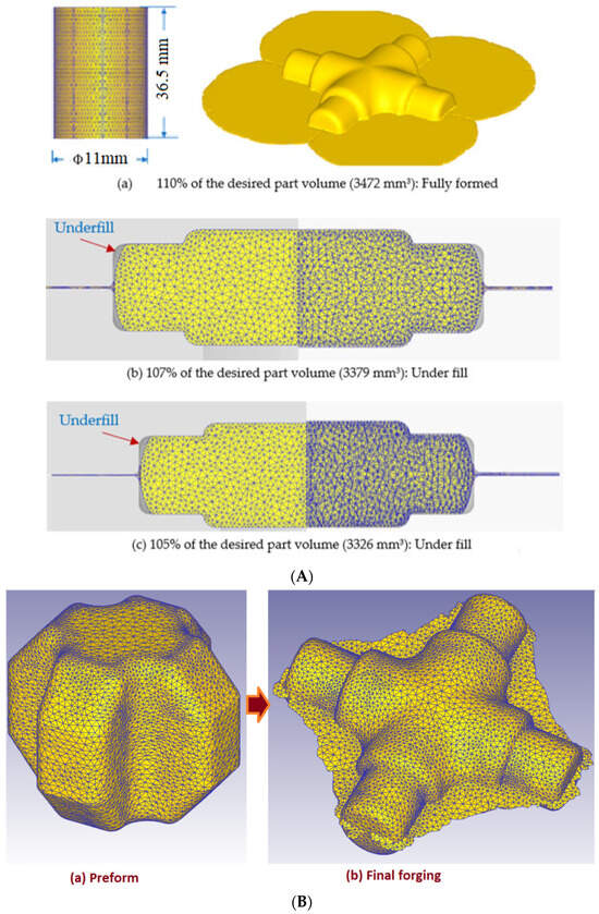 Figure 18 summarizes the simulation results for three billet sizes: (a) 3478 mm3 (110% of the net part volume), (b) 3379 mm3 (107% of the net part volume), and (c) 3326 mm3 (105% of the net part volume). At 110% billet volume (Figure 18A(a)), the cross-joint was fully formed but with approximately 10% material lost as flash. Reducing the billet size to 107% and 105% (Figure 18A(b,c)) led to underfill, indicating that successful forging with these billet sizes would require the use of a preform. Using the preform methodology discussed in Section 3, a sound cross-joint was produced in two stages, as shown in Figure 18 B.