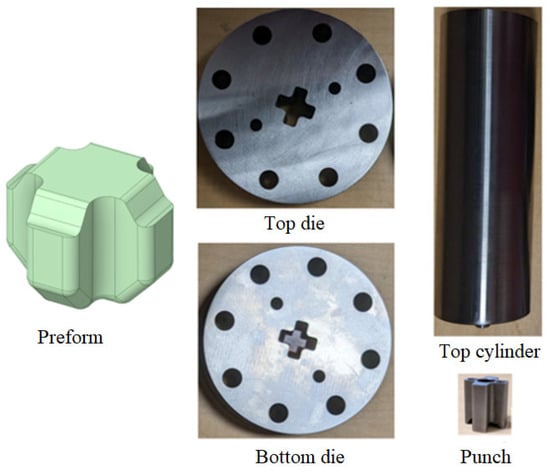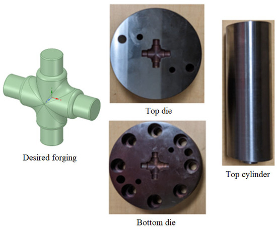 To experimentally validate the preform methodology, downscaled cross-joints were forged in two stages using a 150-ton hydraulic press. Based on FE results, dies and punches for both the preforming and final forging stages were fabricated from H13 tool steel and heat-treated to a hardness of 56 HRC.