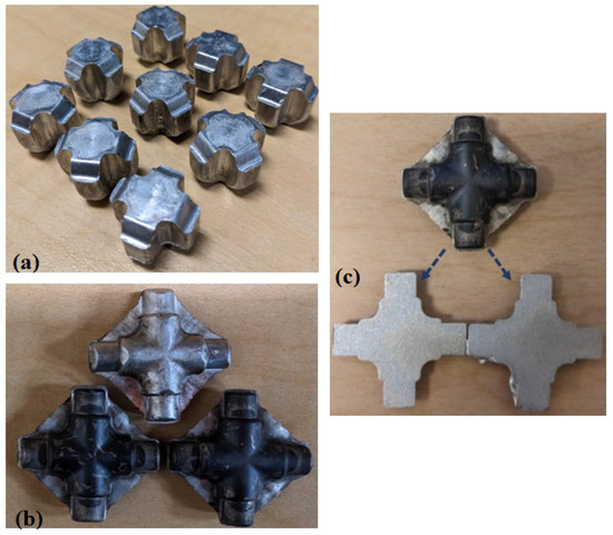 Figure 22a–c present the forged preforms, the final forged cross-joint, and a cross-sectional view, respectively. Visual inspection revealed no surface defects or underfill. A total of nine cross-joints were forged, and dimensional measurements, including overall part dimensions and flash thickness, were obtained using micrometers. The results demonstrated excellent repeatability across all samples. The final forged cross-joint exhibited full die filling, with no visible laps, folds, or discontinuities.