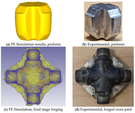 The cross-joint example demonstrates that by introducing a preform stage, at least 5% of billet material can be conserved. While this comes with the added complexity of a multi-stage forging process, the improvement in material utilization can be substantial, particularly for geometrically complex forgings where flash losses are typically significant. In such cases, preforming may be the only technically viable approach to achieving full die fill and sound part formation. The experimental validation presented below was based on the FE model shown in Figure 18B.