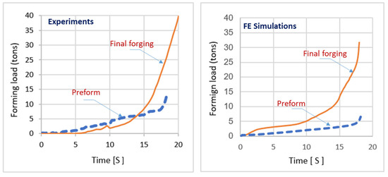 Comparison of the preform and forging loads between experiments and FE simulations.
