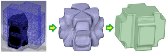 However, frequent re-meshing may introduce artifacts in the reconstructed surface due to small interpolation errors or distortions in the underlying mesh. These may manifest as surface irregularities or jagged edges, particularly in regions with complex, multi-valued flow paths. This effect is illustrated in Figure 8. To address these issues, surface-smoothing algorithms and mesh healing operations are applied during reconstruction to ensure that the resulting preform geometry is continuous and manufacturable. This post-processing step is essential for restoring geometric integrity and enabling reliable input for subsequent FE simulation iterations.