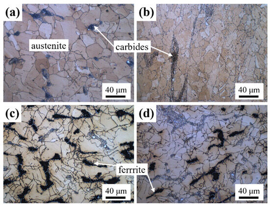 OM micrographs: (a) 6Mn0Al steel; (b) 6Mn2Al steel; (c) 6Mn4Al steel; (d) 10Mn4Al steel.