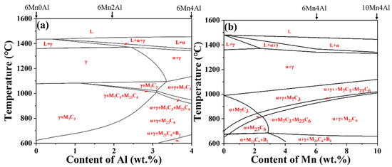 Equilibrium phase diagrams of the experimental steels with different Al and Mn contents calculated using Thermo-calc software: (a) Al contents; (b) Mn contents.