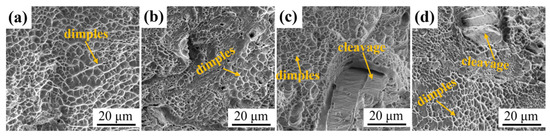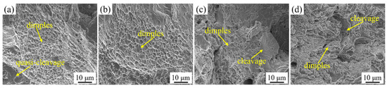 Figure 4 presents the tensile fracture surfaces of four experimental steels obtained by SEM. Due to the occurrences of DIMT and mechanical twinning in 6Mn0Al and 6Mn2Al steels during tensile deformation, both experimental steels exhibit ductile fractures, which are characterized by the presence of dimples (Figure 4a,b). In contrast, Figure 4c,d show the coexistence of dimples and cleavage. This indicates that in 6Mn4Al and 10Mn4Al steels, the ferrite fractured first due to lower capacity for plastic deformation. Subsequently, stress was redistributed and the austenite underwent plastic deformation until fractures occurred.