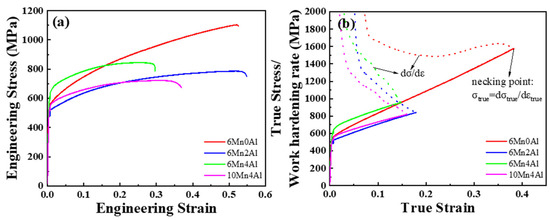 Tensile curves for the experimental steels: (a) engineering stress−strain curves; (b) true stress− strain curves and work hardening rate curves. The dot lines in (b) represent work hardening rate curves.