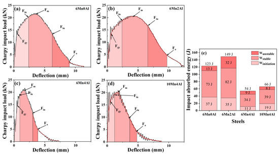 Load−deflection curves obtained using instrumented Charpy impact tests: (a) 6Mn0Al steel; (b) 6Mn2Al steel; (c) 6Mn4Al steel; (d) 10Mn4Al steel; (e) absorbed impact energy at different stages.