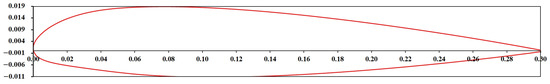 These configurations and dimensions were not chosen by chance. The investigated configurations of the composite box plate are based on the passive BO105 full-scale rotor blade with a C−spar, equipped with NACA23012 airfoils. Figure 2 illustrates the cross-sectional dimensions selected for the full-scale rotor blade BO105. The chord length of the full-scale rotor blade is 0.3 m, which corresponds to the width of box plate W. The thickness of the blade is 0.03 mm and this size corresponds to the height of plate H. The blade planform with a root is 4.9 m in length. The length of a blade without a root and tips, with constant airfoil and stiffness of the blade, is 3.75 m. This dimension corresponds to the length of plate B, respectively.
