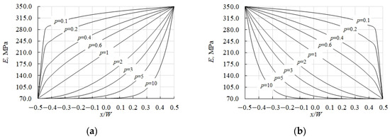 Variations in the Young’s modulus throughout the width of composite box plate for different values of the power law index p: (a) increase in mechanical properties; (b) decrease in mechanical properties.