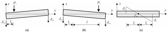 The main design parameters used in the study of composite box plates with functionally graded foam are considered the parameters relevant for the study of helicopter blades. Firstly, this is the location of the centre of gravity ycg and the mass m of the model. These values can be obtained from the numerical solution of the finite element model. The next parameter is the location of the elastic axis yea, the determination of which is a more complex task, requiring the solution of an additional static torsion problem, with two forces applied independently to the two sides of the elastic centre being sought (Figure 4). The force P1 is applied at a small distance from the blade tip. The resulting blade displacement is calculated as Δ1 = Δz1 − Δz2. The second force P2 is applied at a distance l from the force P1 (Figure 4b). The resulting blade displacement is calculated as Δ2 = Δz3 − Δz4.