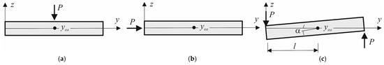 Figure 10b,c illustrate the changes in the centre of gravity and elastic axis location in relation to the direction of the gradient, which alters the material properties of the polymer foam across the width of the box plate. Preliminary calculations showed symmetrical shifts in the locations of centre of gravity and elastic axis. In the case of the box plates with variable thickness (see Figure 9), we observe an asymmetrical pattern regarding the changing locations of the centre of gravity and elastic axis. This depends on the direction of the gradient’s change in the density of the polymer foam material (Figure 10b,c).