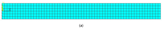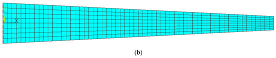 A 3D finite element model was developed using the ANSYS 16.0 software to provide a cost-effective method for evaluating the influence of power law on the stiffness properties of the composite box plate filled with FG foam. The cross-section of the FE model is shown in Figure 6a according to its geometric configuration. The FG foam is modelled with the linear eight-node SOLID185 elements. For the modelling of multilayered composite skin, linear four-node SHELL181 elements were used. According to real conditions, a clamped boundary condition was considered in the model.