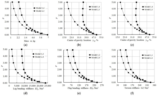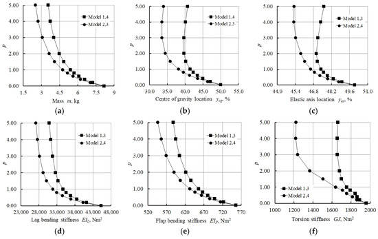 Models 1 and 4 have the same density distribution boundaries (see Table 2); therefore, the mass distribution in them is the same, while the mass of Model 2 corresponds to the mass of Model 3 (see Figure 7a). Since the mass of the structure and its distribution affects the centre of gravity’s location, Models 1 and 4, and Models 2 and 3, respectively, have centres of gravity that share locations (see Figure 7b). The changes in elastic axis location, lag bending stiffness, flap bending stiffness, and torsion stiffness are affected by the overall rigidity of the structure, which includes the geometry and elastic modulus. Therefore, the behaviour of the corresponding curves (see Figure 7c–f), according to the change of material properties and geometry in Table 2, is the same for Models 1 and 3, and Models 2 and 4, respectively.