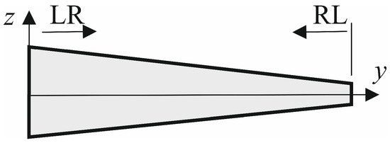 According to Figure 3a, Young’s modulus increases from the left side to the right side. However, in this study, the main calculations are performed for the opposite situation, when the elastic modulus and the filler density decrease from left to right. This is because for aircraft structures such as a blade, the centre of mass is located at the beginning of the profile to prevent flutter [51]. In this case, Equations (5) and (6) have the following forms:
