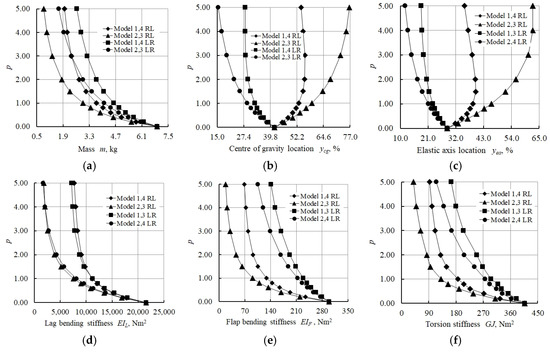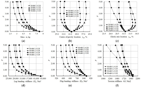 The behaviour of the curves, describing the flap bending and torsion stiffnesses depending on the power law index p, is shown in Figure 10e,f. It is evident from the figures that the stiffness of the RL models is less than that of the LR models.