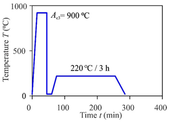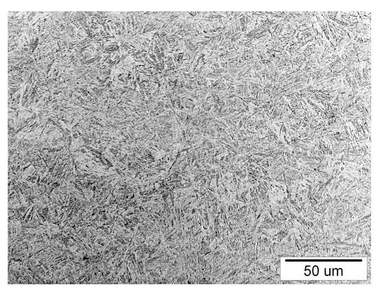 The material that was tested was heat-treated Protac 500 steel. The heat treatment was performed so that the material was tempered to a temperature of AC3 900 °C, then to a low temperature, tempered at a temperature of 220 °C, where it was held for 3 h; Figure 1. The material’s tempered martensitic structure was obtained by low temperature tempering; Figure 2.