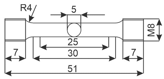 The new mechanical properties of this heat-treated material were obtained through mechanical tests: tensile test, instrumented Charpy test and hardness measurement. The tensile test was performed according to standard EN ISO 6892-1:2019 by using method B [29] on the servo hydraulic Amsler 559/594 universal testing machine (Amsler Prüfmaschinen A.G., Merishausen, Switzerland—now Amsler Prüfsysteme, Neftenbach, Switzerland), and cylindrical specimens were prepared according to Figure 3. The hardness was measured on Roell-Zwick Z600 (Zwick Roell Group, Ulm, Germany) using a Vickers pyramid according to EN ISO 6507-4:2005 [30], with a load of 98.1 N at three different locations. For the Charpy impact tests, an instrumented Charpy pendulum Amsler RPK300 (Amsler Prufsysteme, Neftenbach, Switzerland) was used, according to ISO 148-1 [31], with the geometry of the specimens ISO V-notch, according to Figure 4. All experiments were performed at room temperature +20 °C.