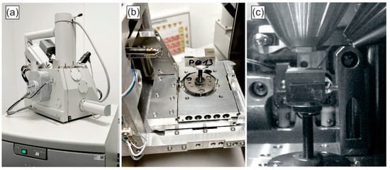 SEM microscope (FEI Company, Hillsboro, OR, USA) and preparation of the specimen P03; (a) Quanta 200 3D; (b) fixing the specimen; (c) SEM chamber with P03 specimen.