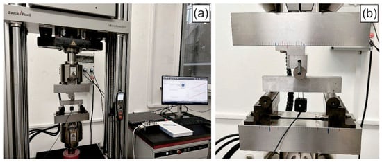 In order to obtain the critical values of the J integral and δ according to the ASTM E1820 standard, the experimental part (pre-fatigue, test and post-fatigue) was performed on resonant Vibrophore 100 tensile machine manufactured by Zwick Roell company (Zwick Roell Group, Ulm, Germany), Figure 6a, at the Faculty of Mechanical Engineering in Maribor. Also, Figure 6b shows the configuration of the sample on the machine. The SENB specimens, shown in Figure 7a,b, were used for the experiment, and the dimensions of the specimens are in Table 4. The experiment was performed at room temperature.