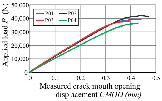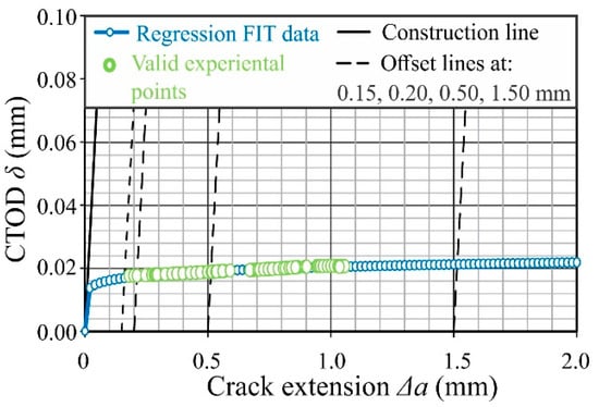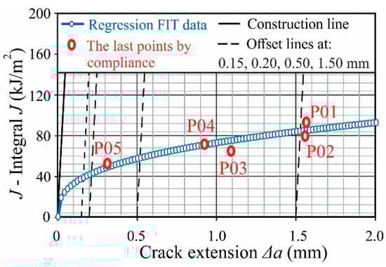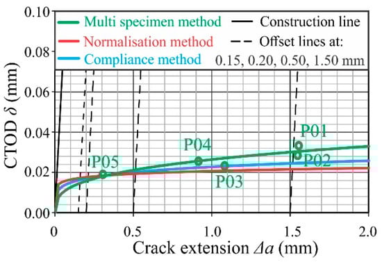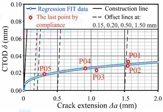 The measured values of P-CMOD for P01 to P04 are shown in the diagram in Figure 8. The normalization method for crack growth monitoring according to the ASTM E1820 standard is shown in Figure 9 (the normalization performed on the P03 specimen was taken as an example). The displacement value-CMOD in relation to the force is measured for each specimen. Then, the fracture of the specimen follows, and the crack and the remaining ligament are measured. The results are obtained based on the J-∆a and δ-∆a resistance curves, which are drawn as shown in Figure 10 and Figure 11 (for example, the J-∆a and δ-∆a resistance curves for specimen P04 are taken). Engineering critical values are calculated as intersections of the resistance curves and the parallel offset of the construction line ∆a = 0.2 mm, representing the crack’s blunting and expansion for 0.2 mm. The maximum value is limited to Jmax, because at the condition J > Jmax, the plastic deformation becomes significant, so the crack’s behaviour does not depend on the material but on the remaining ligament. The results of the normalization method are shown in Table 9. For specimen P05, it was not possible to perform the normalization process due to the too short crack propagation.