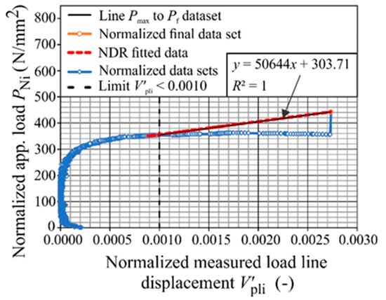 For the calculation of fracture toughness according to the normalization method, which includes factors, such as the geometry of the specimen (height, width, length of the premachined notch) and material characteristics (yield strength, tensile strength, Young’s modulus of elasticity, Poisson’s ratio), everything starts from the so-called “raw” experimental data F-CMOD (blue circles shown in Figure 9). The other drawn lines serve us for the correct selection of the points that we need to take and normalize. The orange circle shown in Figure 9 represents the normalized final data set as a subset of the data that was filtered from the original set, used in the linear part of the curve, and used to calculate the J-integral. The data for the normalized final data set meet the condition of the standard v′pl > 0.0010, which means that they are above the values that indicate stable crack growth, and all data for which v′pl < 0.0010 (black dashed construction line in Figure 9) are rejected because they do not satisfy the criterion for a valid evaluation of toughness. The fitted data are represented by a red line in Figure 9; they are NDR fitted data (Normalized Data Regression), which represent a regression/approximation line through a set of normalized points to show the perfect agreement between the fitted line and the data (the equation of the regression line and the coefficient of determination is always given next to the line). For validation and comparison with NDR fitted data, the data between the maximum force Pmax and the final force Pf (black line in Figure 9) are used, which defines the part of the load where unstable crack growth occurs. The importance of the diagram shown in Figure 9 is that it shows how valid ones (orange data) are extracted from the experimental data (blue data), then regression analysis (NDR fitting) is applied to them, and the result is used for further calculations of fracture toughness.