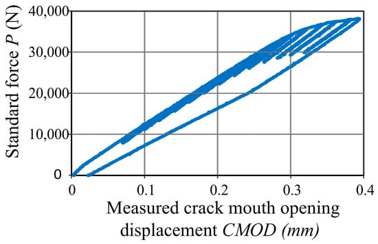The load during the main part of the experiment (fatigue) was performed according to the standard. The calculated force Pm, which is defined for the compliance method, tells us what load we have to apply for the first three times with unloading to half the value of that force. With the first three loadings and unloadings, it is very important that we are in the elastic zone of the material, and that there is no plastic deformation, because these slopes are taken as reference and in relation to them, the further progress of the crack growth is measured. Each subsequent loading was performed with a CMOD step of 0.2 mm and a speed of 0.010 mm/s. The experiment continues until the P-CMOD curve drops slightly after the maximum force that the material can withstand.
