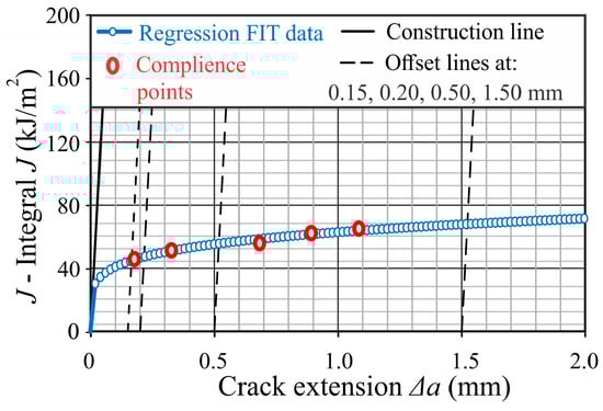 Based on the obtained data, a J-∆a curve diagram was constructed on which the fitting line is constructed according to the ASTM E1820 standard. JIC was obtained from the intersection of the parallel line with the construction shifted by 0.2 ∆a and fitted J-∆a curve. From the size of the critical JIC integral, the value of the critical stress intensity factor or the fracture toughness at straight deformation KJIC can be calculated using the dependence (Equation (7)) [7]: