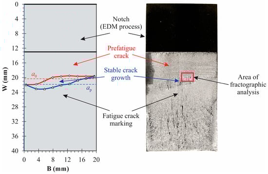 For pre-fatigue crack to occur, it is necessary to respect the standard. According to the standard, the final length of the pre-fatigue crack must be within the values according to Equation (14) [7]: