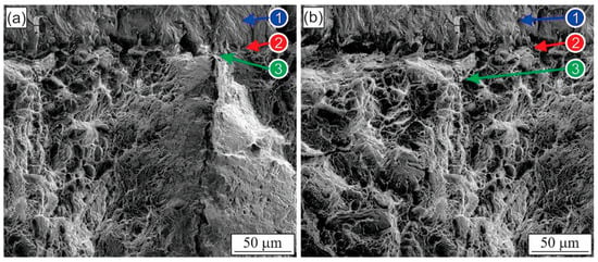 Fractography analysis has been used for many years (approximately half a century) as a post-mortem tool to determine fracture patterns and to assess the fracture toughness of brittle or ductile components [43]. The scientist’s task is usually to inspect the fracture surface with the naked eye, then make a microscopic or fractographic analysis. With fractographic analysis, it is possible to recognize whether the shape of the crack shows some correlation with the fault in the structure or whether the crack spreads along the grain or through the grain [44,45]. In this experiment, scanning electron microscopy was used, which helps additionally in the description of the behaviour of the material and complements the analysis of the path of the crack inside the microstructure [46]. The scanning Microscope Quanta 200 3D (FEI Company, Hillsboro, OR, USA), Figure 5a, was used for the fractography analysis. The preparation of specimen P03 before putting it into the chamber of the scanning microscope is shown in Figure 5b,c.