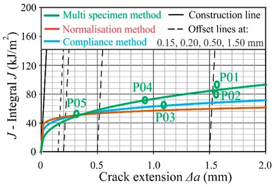 The multi-specimen method requires four or more specimens, which makes it one of the most expensive and most accurate methods. Each specimen is separately loaded to the selected load level and unloaded to obtain the increase in crack length ∆ap. Each specimen is then broken to reveal the surface of the crack. The multi-specimen method follows the compliance method so that the values of the last points are taken from the resistance curves J-R and δ-R from the compliance method. Based on these last points, a new or the most accurate J-R and δ-R resistance curve is drawn [7]. Sometimes the parameters obtained from previous methods are not the most reliable because the test was performed on one or two specimens. For this reason, the multi-specimen method gives the most accurate parameters, takes into account several specimens, and is, therefore, applied to all materials where it is very important to determine the fracture toughness [35]. In addition to the ASTM E1820 standard, there are many other standards for determining fracture toughness (ASTM E1921, ASTM E399, etc.) [36].