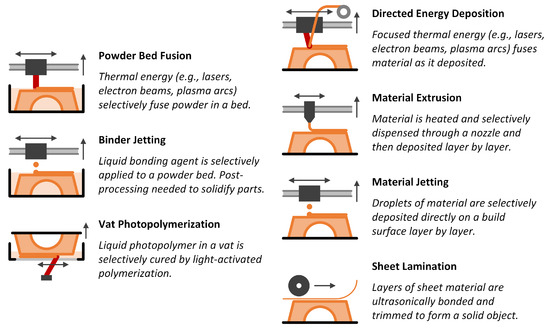 Additive manufacturing (AM) is a fast-developing technology within Industry 4.0 that can enable smarter production of manufactured parts and improved material efficiency. AM is a fabrication method that builds successive layers of material to make a part, rather than removing material from stock, as with conventional manufacturing (CM) techniques. The AM process has many benefits, including significantly less material waste, unique designs that are not achievable via CM techniques, the ability to lightweight designs while maintaining overall strength, consolidation of assembly parts, and repair of existing parts [11]. The American Society for Testing and Materials (ASTM) defines seven categories of AM [12]. Material bed techniques selectively melt, glue, cure, or weld cross sections of a part in a prepared layer of material (see the left column of Figure 1). This process is repeated until the entire part is built, after which excess powder can be sifted and removed. Deposition techniques directly build layers of material on top of each other or trace paths in 3D space (see the right column of Figure 1). Powder bed technologies tend to be slower but more precise when compared with deposition technologies. AM technologies exist to print many kinds of materials, including metals, polymers, and ceramics.