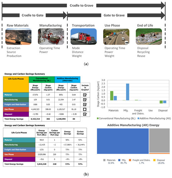 A life cycle assessment (LCA) is a method for analyzing the environmental and energy impacts of a process, product, or material throughout a product’s life cycle from cradle to grave [22]. Analysis usually follows the production process, stepping from material extraction through to production, distribution, use phase, end of life, and recovery/disposal. LCA can assess various aspects of production, including energy usage, total emissions, water usage, and a variety of other metrics for environmental impact. Results help stakeholders make responsible business and design decisions with the least impact on the environment. Outcomes also help to identify opportunities for closing the production cycle (using open- and closed-loop recycling), making for a more circular manufacturing process.