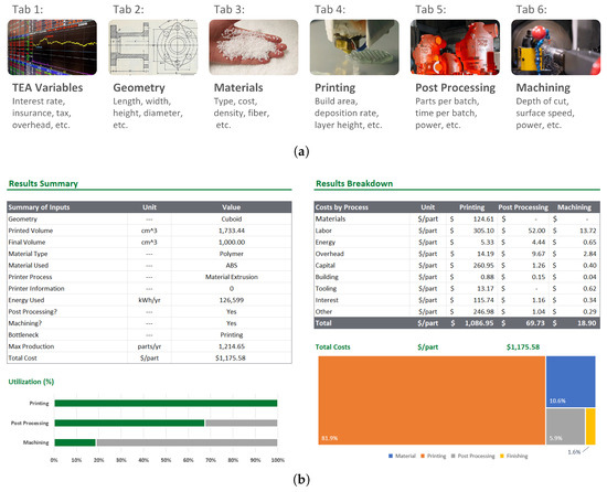 The AMCAC tool analysis follows the six steps outlined in Figure 3a. In “Step 1—TEA Variables”, users select from three levels of cost analysis. In “Default” mode, the analysis uses a set of default values for cost variables (e.g., interest rate, energy cost, labor cost) from literature and previous studies, which are applied to all production steps. In “Intermediate” mode, users can edit these default values, and in “Advanced” mode, users can set different values for each production step. In “Step 2—Geometry” and “Step 3—Material”, users specify part characteristics, including the basic shape, material type, and material cost. In “Step 4—Printing”, users choose between four types of printing processes (binder jetting, material extrusion, material jetting, and vat polymerization) and set machine and operational parameters (e.g., operating hours, capital cost, and setup time). Similarly, in “Step 5—Post Processing” and “Step 6—Machining”, the user specifies aspects of any required post-processing (e.g., sintering, heat treatment, UV curing) or subtractive machining (milling or turning depending on part geometry) required to meet final part specifications.