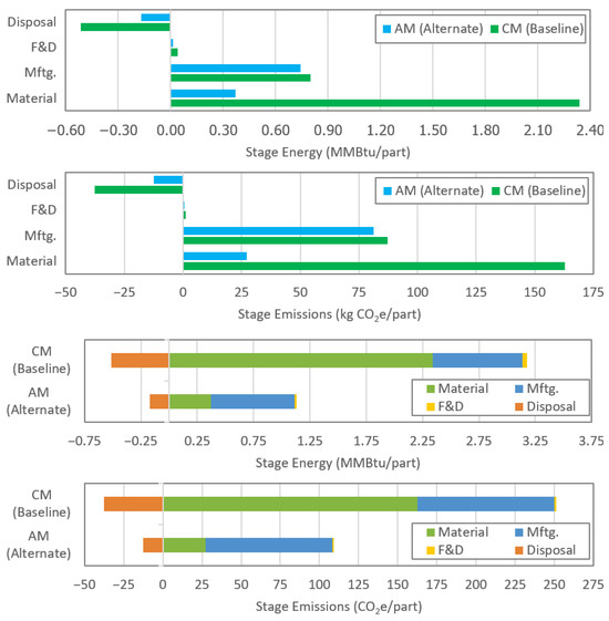 AMECIA tool results (Table 1 and Figure 5) show that for both CM and AM, nearly all life cycle energy and GHG emissions associated with the bracket occur in the use phase (approximately 97%). The lighter-weight, AM-optimized part reduces use-phase energy and GHG emissions, as well as freight and distribution energy and emissions, by 65%. The embodied energy of the raw materials was the next largest energy and emissions source, requiring over 2.3 MMBTU for each CM part, resulting in around 160 kg CO2e or 2% of the life cycle impact, but only 0.37 MMBTU for the AM part, resulting in less than 30 kg CO2e, or less than 1%. This is due to the substantial decrease in material needs (AM requires 93% less primary material) resulting in an over 80% decrease in material embodied energy and carbon. If the part is recycled at EoL, the CM part can offset its material impact by over 20% and the AM part by over 45%. CM manufacturing requires about 0.80 MMBtu per part due to its heavy machining (estimated to be over 30 h); conversely, the AM part only requires about 0.74 MMBtu due to the high efficiency of the directed energy deposition (DED) process and substantially reduced machining. Overall, the AM part used 93% less material and required 65% less energy, with a corresponding emissions reduction of 65%.