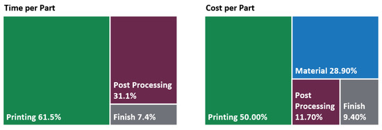 Results from the tool can be used to help manufacturers and researchers identify areas in AM production that represent the largest barrier toward adoption. The bottleneck analysis highlights the limiting step of the production process, prompting further analysis of part design and specifications. Redesigned parts can significantly reduce lead time and, therefore also, labor, overhead, and tooling costs. Breakdowns of time and cost provide an understanding of where efforts should be focused to reduce costs within each step and for the process overall. The tool, therefore, provides insight into the economic feasibility of AM, incorporating issues such as product quality through yield rate specification and how production variables like material selection and batch size affect overall cost.