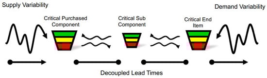 DDMRP is grounded in a bimodal inventory distribution model that defines two critical boundaries: the stock shortage and stock excess points. The method determines these levels using demand forecasting and supply chain Lead Times while maintaining continuous stock level control through demand-driven replenishment orders. A key feature of DDMRP is its use of “decoupling/isolation points”, which are strategic buffers used to mitigate the impact of variability on material flow throughout the supply as shown in Figure 1: