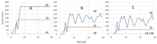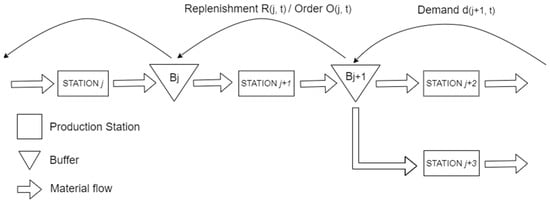 To ensure that buffer levels remain non-negative, a maximum function is applied. It is important to note that even if an order of units is placed, the actual quantity received depends on the availability in the buffer of the first upstream station that has a buffer. Therefore, the model uses the minimum between the ordered amount and the buffer level of the first upstream station that has a buffer. This formulation reflects the constraint that a station cannot receive more than the upstream station is able to provide. Equation (7) defines the on-order inventory, where refers to the on-order inventory for station j at 0: