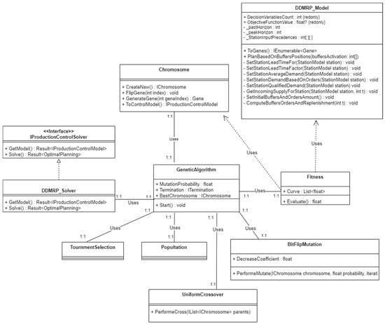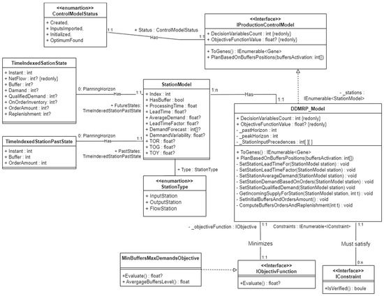 As shown Figure 4, regarding our implementation, the central class of the domain layer is the DDMRP Production Control Model (DDMRP_Model), which implements the IProductionControlModel interface. This class encapsulates the Demand-Driven Material Requirements Planning model presented in Section 3 and includes: