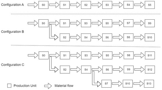 - The system consists of J production stations arranged in a topology with diverging branches, designed to accommodate the processing of multiple product references.