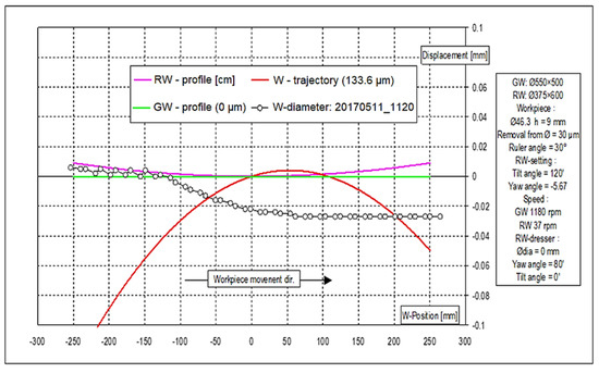 The amplitude of oscillations in the grinding process decreases with time and with position on the circumference because vibrations are damped by friction and, as a result of friction, deformation changes occur in the contact conditions between the grinding wheel and the workpiece (micro-wear). This is the stage when the grinding process starts, so that self-excited oscillations appear in the system, which have a higher amplitude owing to the feedback between the cutting force and oscillating motion. The exponential decrease in amplitude along the measurement path represents the damping of the “transient phenomenon.” At the start of the grinding cycle or at the initial contact of the tool with the workpiece, there is often also an initial stronger “shock” or excitation of vibration with a significantly higher amplitude.