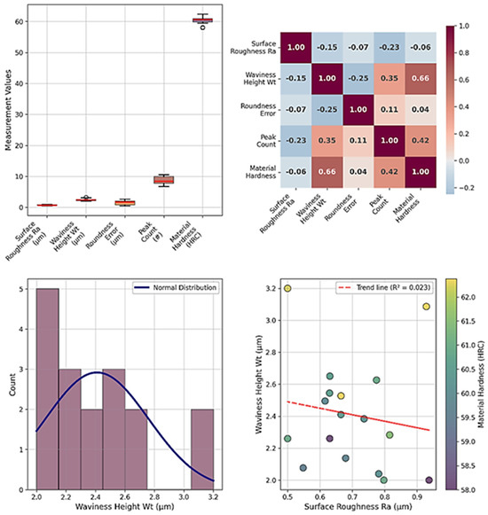 Our experimental findings reveal an important material geometry relationship. Hardness-Waviness Correlation (r = 0.65): This significant correlation reflects heat treatment effects, microstructural changes during quenching, and varying machining conditions for harder materials. The finding enables hardness-based waviness prediction and process optimisation, consistent with literature by Duma et al. [38] and Sri Siva et al. [39].