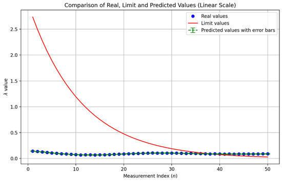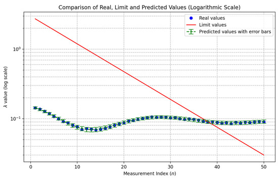 Figure 4. Comparison of real, limit, and predicted values. - Logarithmic display (Figure 5). The data were also plotted on a logarithmic scale, which facilitated the effective visualization of differences, particularly when there was a substantial range of values between the initial and final measurements. This approach enhances the clarity of the rings, wherein oscillations decay more rapidly.