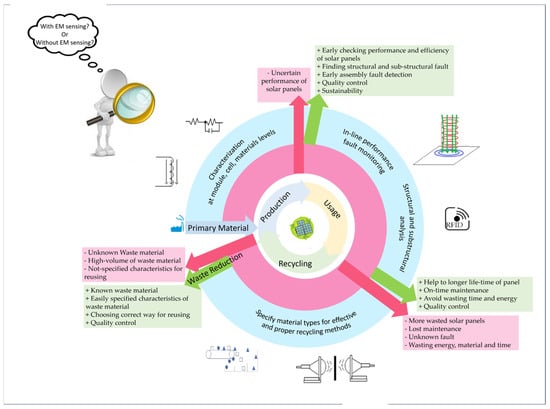 This review has demonstrated the transformative potential of electromagnetic (EM) monitoring techniques in advancing sustainable manufacturing and materials processing across the Production–Usage–Recycling (PUR) cycle of solar energy components. By integrating EM techniques into each phase of this cycle, the solar energy industry can achieve significant improvements in material efficiency, process optimization, and product reliability, while minimizing environmental impact and promoting a circular economy.