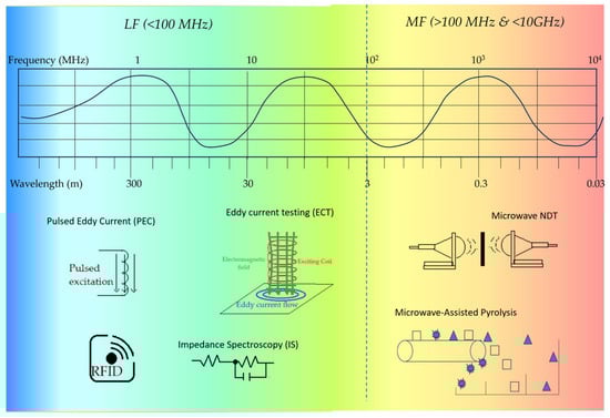 Electromagnetic (EM) monitoring techniques are non-destructive metrology tools that can be beneficial for ensuring the quality, performance, and sustainability of solar energy components throughout their lifecycle [28]. Given the wide range of frequencies for EM sensing, this review categorizes these techniques into low-frequency (<100 MHz) and medium-frequency (100 MHz–10 GHz) methods based on their operational frequency ranges. The list of methods according to their frequency of performance is shown in Figure 2. Each category offers unique capabilities and applications in the production, usage, and recycling phases of solar energy components.