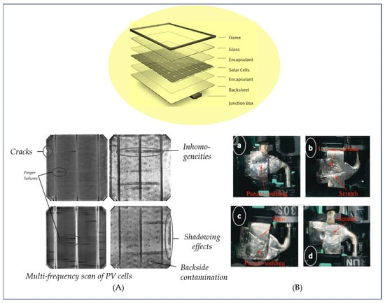 Faults detected on solar panel surface and on joints with methods. (A) Eddy current scans with different frequencies of mono-crystalline solar cells with different defects [13]. (B) Experimental specimens: (a) pseudo-welding defect; (b) scratch and uneven surface defects; (c) dent and pseudo-welding defects; (d) scratch defect [13].
