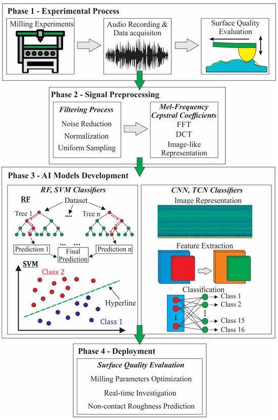 The present study successfully demonstrated a robust pipeline for evaluating the surface roughness in milling processes using sound data and learning-based methodologies. By associating each recorded sound signal with a corresponding surface roughness quality, the proposed methodology enables precise classification through a series of well-integrated stages, ranging from signal acquisition and preprocessing to feature extraction, model training, and evaluation. The signal preprocessing pipeline ensures data consistency and maximizes the information retained for classification purposes. In addition, the utilization of MFCCs as the primary feature representation effectively captures relevant spectral and temporal information from the sound signals, enabling the applied AI classifiers to distinguish between various surface finish classes. The architectures of the developed models successfully extract discriminative patterns and demonstrate efficient training convergence and generalization capabilities when validated on a test dataset. In addition, due to the model’s learned representation space, unseen sound signals would be mapped to the closest existing cluster in the feature space, enabling reliable classification even with minor variations. Overall, the proposed framework provides a lightweight, non-intrusive, and scalable solution for surface roughness classification and enhancement, making it well-suited for deployment in intelligent manufacturing environments. However, it is important to note that this study has limitations stemming from its specific experimental setup. The analysis was conducted using a single material, cutting tool, and milling machine under fixed operating parameters. These restrictions underscore the need for additional validation across a wider range of operational conditions. In order to enhance generalizability, future research could expand the dataset to include multiple machines, tool types, workpiece materials, and cutting conditions beyond those used in training. This approach would allow the model to develop more robust and generalizable sound signal representations. Furthermore, domain adaptation and transfer learning methods could be investigated to fine-tune pre-trained models for new operating environments using limited labeled data. Another promising strategy is to enhance the training dataset through synthetic or semi-synthetic audio signals that emulate diverse machining conditions, thereby improving model variability and operational resilience.