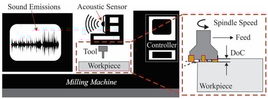 Regarding the data acquisition procedure and the evaluation of the surface quality, an experimental dataset was utilized that consists of 7.444 audio recordings of sound signals during the milling procedure [25,26], as schematically illustrated in Figure 2. The purpose of this dataset was to explore how variations in the values of certain milling conditions affect the surface roughness, ultimately determining the quality of the machined products. These audio data were collected for different combinations of spindle speed, feed rate, and depth of cut. Moreover, the experiments were carried out in a controlled environment to minimize external noise that could compromise the accuracy of the recorded audio data. It is noteworthy that mechanical vibrations and equipment interference can significantly impact the quality and interpretation of sound emission signals during milling operations [27]. Structural vibrations from the spindle, guideways, or drive systems may introduce low-frequency noise that modulates the high-frequency sound emissions generated by tool-workpiece interactions. Additionally, electromagnetic interference from motors and controllers may introduce broadband electrical noise that contaminates the raw audio signal [28]. These interference effects can lead to misinterpretation of signal features, particularly when using time–frequency analysis methods where overlapping spectral components may obscure the characteristic signatures of surface formation mechanisms. Hereupon, the employed controlled setup was essential to ensure the integrity of the experimental data, enabling a more reliable analysis and interpretation of the sound characteristics associated with milling operations.